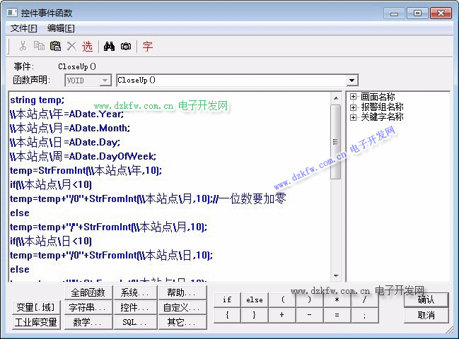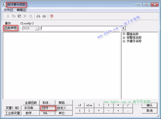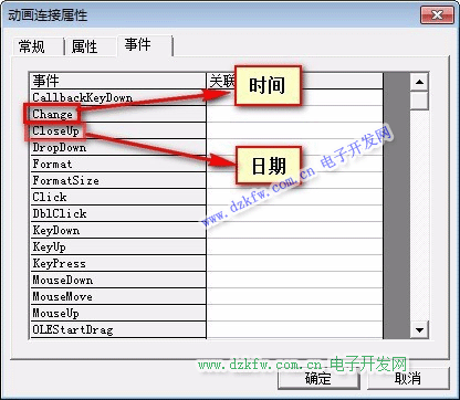在动画连接属性,选择“事件”,双击“CloseUp”事件的关联函数,弹出“控件事件函数编辑框”。