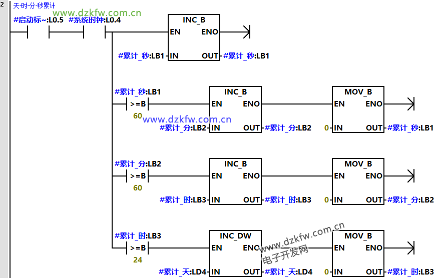 (2)程序段2是当启动标志位接通之后,利用系统时钟1HZ脉冲接通“秒”累计,当到达60秒后“分钟”地址加1,同时“秒钟”清零;当到达60分钟后小时地址加1,同时“分钟”清零;当到达24小时后“天”地址加1,同时“小时”清零。