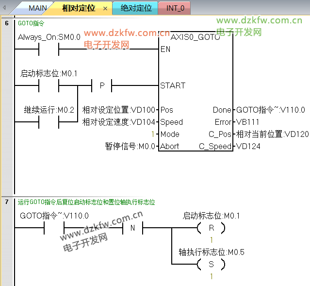 相对定位的需要记录运行前的位置,暂停后把当前位置和运行前的位置进行运算,继续运行时把剩余距离赋值到GOTO指令中的设定位置,具体程序如图3—图7所示,程序有注释讲解,这里不做过多的介绍,有问题可以在评论留言。
