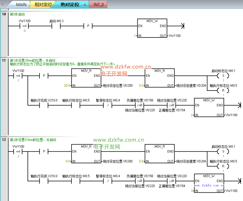 绝对定位的位置是唯一的,暂停后继续执行GOTO指令即可,不需要和相对定位那样记录位置,并且绝对定位误差较小,更适合应用于往复运动的定位控制,不容易产生太大的误差,具体程序如图8—图12所示,程序有注释讲解,这里不做过多的介绍,有问题可以在评论留言。