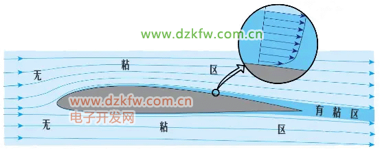 空气在机翼附近处运动,由于气体与固体表面存在吸附力,表面那一层气体分子被粘在机翼上,离开机翼较远处,气流则保持较高速度。因此会存在这样一层,其内部气流有较大的横向速度梯度,如圆圈所示,这部分粘性力比较大,称为有粘区。而较远处速度梯度很小,粘性力可以忽略不计,这些区域称为无粘区