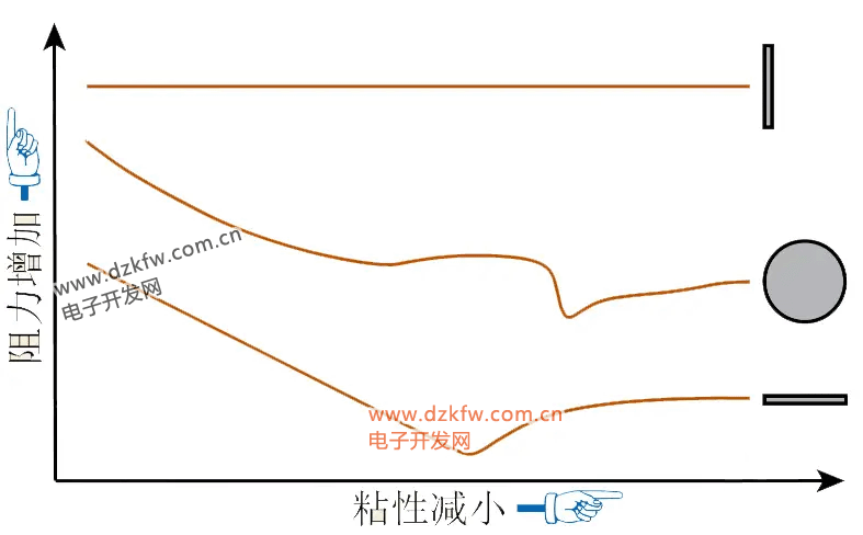比较不同形状物体受到的阻力。把物体放在固定流速的流体中,逐渐减小流体的粘性,观察阻力变化。可以看到,如果是处置放置平板,阻力与粘性无关,因为其阻力全部为迎风面和背风面的压差造成,而顺流放置平板,刚开始阻力随粘性增大而减小,但粘性减小到一定程度后,阻力突然增大,球体的变化则更加复杂,造成这种现象的原因与两个因素有关:一是湍流;二是流动分离
