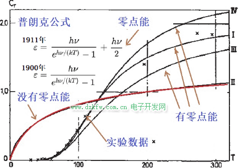 根据普朗克新表述的辐射公式,量子系统所拥有的能量不能低于零点能。普朗克当时并不很在意这个(1/2) hν,但却很快地引起了正在研究统计中涨落公式的爱因斯坦(Albert Einstein,1879 -1955)的注意。爱因斯坦说:“零点能可能真的存在!”,并和他的助手奥托·施特恩(Otto Stern,1888-1969)一起写了一篇文章:假设双原子分子的旋转能含有零点能,并且所有双原子分子以同样角速度旋转,然后计算出双原子分子气体的比热。将氢气的理论比热与实验数据相互比较(图22-2的曲线),用零点能的概念解释了氢低温比热的实验结果,证明了零点能存在的必要性[2]。后因为保罗·埃伦费斯特(Paul Ehrenfest,1880 -1933)给出更具一般性的计算,据说他们又撤回了那篇论文。