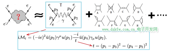 总结一下上面的解释:电子-电子散射时,最主要的相互作用是正比于电子电荷e平方的项,其散射概率可以用电子场和光子场根据图下面的数学公式表示的函数,对时空变量进行积分计算而得到。