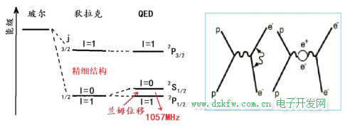 图22-6左图,比较了三种理论框架下的部分氢原子光谱:玻尔模型中的一个简并能级在狄拉克相对论理论下分裂成精细结构。然后,更为精细的兰姆位移可以用QED理论解释。氢原子基态能级是13.6ev,精细结构只有基态数量级的十万分之一,兰姆位移又只有精细结构的十分之一。