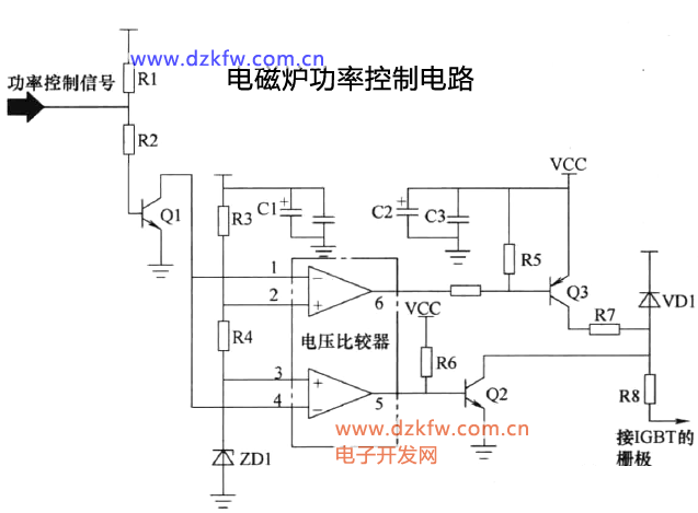 电磁炉功率控制电路的作用是控制IGBT的开与关,以控制电磁炉的发热功率。功率模块的内部电路主要由电压比较器、外围电阻、外围电容、钳位二极管、稳压二极管和外围驱动晶体管等组成。其工作原理如下: