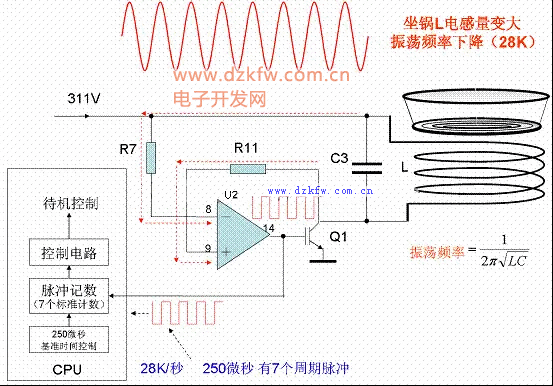 图2所示;就是脉冲锅检的电路原理图;这个在坐锅时的振荡频率为28K;经过比较器电路U2B的(14)脚输出28K频率的方波;这个方波除了去激励IGBT功率管之外,还送往电磁炉的CPU控制电路中的脉冲计数电路。脉冲计数电路对U2B(14)脚送来的振荡信号进行以250微秒为一个时间段;对振荡信号进行取样计数,如果坐锅时;振荡频率为28K/秒,那么在250微秒的时间段,就能检测到7个振荡周期的方波。此时CPU内部的脉冲计数电路也是以250微秒时间端7个脉冲标准计数(考虑到锅的差异及锅放置位置的差异可以对6至8个脉冲的计数都属于正常计数范围,也就是坐锅时;振荡频率可以由24K到32K范围都正常)。这时计数电路在250微秒计数,通过的脉冲数7个正常,电路则维持启动正常工作继续对锅及食品加热。