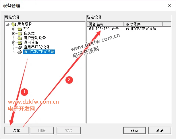 第七步:(选择通用TCP/IP父设备,点击新增,右侧选定设备就会自动添加进去。)