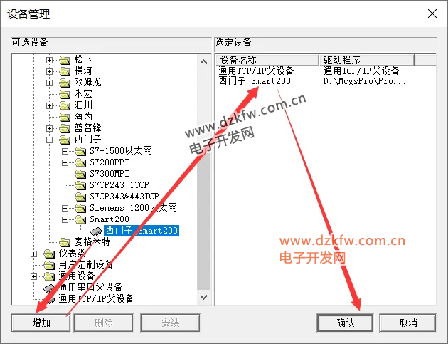 第八步:(鼠标选中西门子Smart200,点击新增,右侧选定设备就会自动添加进去。)