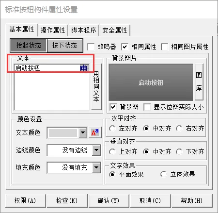 第二步:(工具箱-标准按钮-基本属性输入启动按钮)
