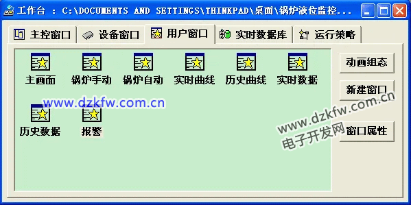 口:主画面、锅炉手动、锅炉自动、实时曲线、历史曲线、实时数据、历史数据、报警。一个用户组:命名为“工作组”。两个用户:分别命名为a、b,均为“工作组”组。四个主菜单:分别是画面、曲线显示、数据 显示、报警显示。三十一个变量:分别是:(开关型:S1、S2、高水位灯、低水位灯、超压灯、低压灯、燃烧正常灯、计时条件、计时状态、 复位条件、水泵、水泵2、进水阀、加煤、送煤机、送风机、排风机、 出渣、炉排)、(数值型:当前值、设定值、锅炉水位、锅炉水位2、压力、压力2、高水位、低水位、超压、低压)、(组对象:液位组、液位组1)。画面由锅炉体、送煤机、送风机、排风机、进水阀、出渣、 炉排、定时器、高水位灯、低水位 灯、超压灯、低压灯、燃烧正 常灯、流动快、标签组成。
