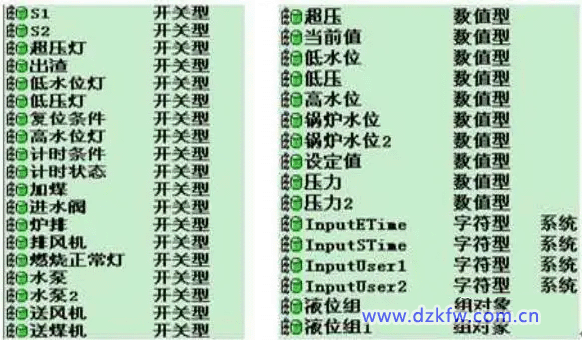 实时数据库是工程的数据交换和数据处理中心。数据变量是构成实时数据库基本单元,建立实时数据库的过程也即是定义数据变量的过程。定义数据变量的内容主要包括:指定数据变量的名称、类型、初始值和数值范围确定与数据变量存盘相关的参数。此时要将各变量的名称、类型正确编写。在锅炉液位监控系统工程中建立31个变量,其中19个为开关型变量、10个为数值型变量和2个组对象。数据对象如图实训7-5所示。