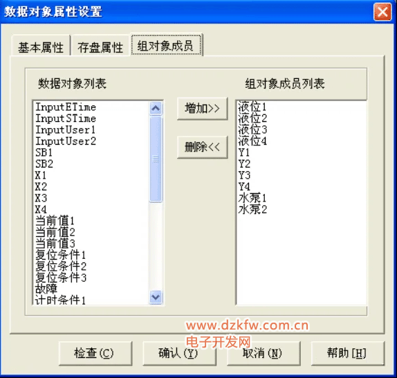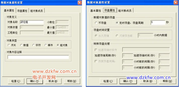 锅炉液位监控系统工程中共建立了两个组对象变量。数据对象的建立以液位组变量的属性设置为例进行讲解: 组对象的基本属性,将对象名称为:液位组;对象类型为:组对象;其他属性设置不变。组变量的存盘属性中数据对象存盘选中定时存盘,存盘周期设为5秒。