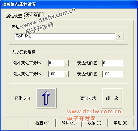 (1)锅炉水位的属性设置;在用户窗口中,双击自动窗口 进入,选中锅炉锅炉水位构件双击则弹出单元属性设置窗口。把表达式的值改为锅炉水位 最小表达式的值改为0 最大表达式的值改为100。具体设置参照如图实训7-8所示。