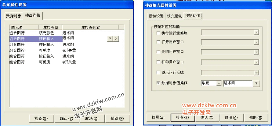 (2)开关型构件的属性设置;在用户窗口中双击自动窗口 进入,选中水泵变量双击,则弹出单元属性设置窗口。选中 组合图符单击