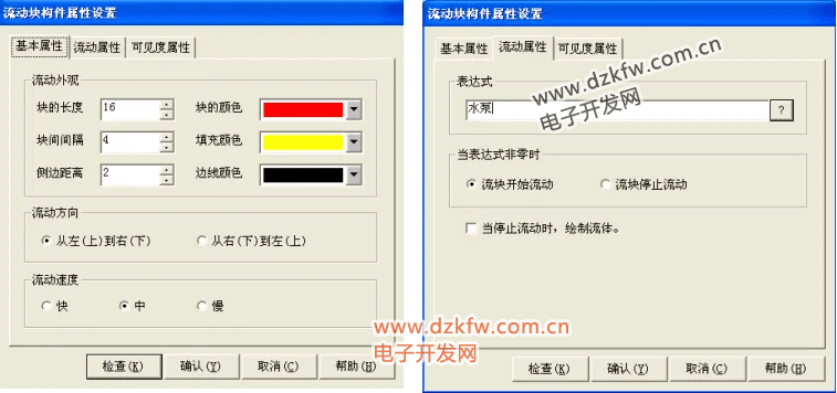 (3)流动块构件属性设置:在用户窗口中双击自动窗口进入,选中水泵上面的 流动块双击则弹出流动块构件属性设置窗口。水泵上侧的流动块在流动块构件属性设置窗口中,表达式为:水泵,其他属性不变。其余流动块也相同进行设置即可,如图实训7-11所示。