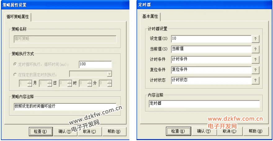 定时器的属性设置:双击“定时器”进行基本属性设置,连接相应的变量进行如下属性设置。循环策略中有2个定时器,2 个定时器设定值都改为10即可。其他定时器属性设置参考图实训7-13所示进行相应的属性设置。