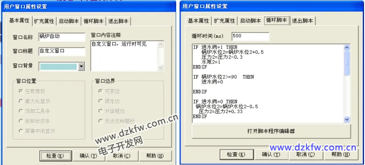 在用户窗口中也编辑了脚本程序,这个脚本程序是用来完成特定操作和处理的程 序。脚本程序设计的动画效果,来控制 “锅炉自动”窗口的属性中的循环脚本程序。打开方式如图实训7-14所示。循环脚本程序如图实训7-15所示。