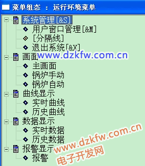 11主菜单建立主菜单的建立如下:双击打开 主控窗口 新增四个操作集,分别命名为“画面”、“曲线显示”、“数据显示”、“报警显示”。在“画面”下,新增三个操作,分别命名为“主画面”、“锅炉手动”、“锅炉自动”。在“曲线显示”提示 框新增的两个操作;分别命名为“实时曲线”、“历史曲线”。在“数据显示” 提示框下新增两个操作;分别命名为“实时数据”、“历史数据”。在“报警 显示”提示框下新增一个操作;命名为“报警”。然后分别对它们的菜单属性进行设置,设“打开用户窗口”为各自对应的窗口分别为“主画面”、“锅 炉手动”、“锅炉自动”、“实时曲线”、“历史曲线”、“实时数据”、“历史数 据”、“报警”。最后在“主控窗口”的属性设置中“菜单设置”设为”有菜单”。锅炉液位监控系统工程的主菜单就完成了,如图实训7-22所示。实际效果图如图实训7-22 所示。