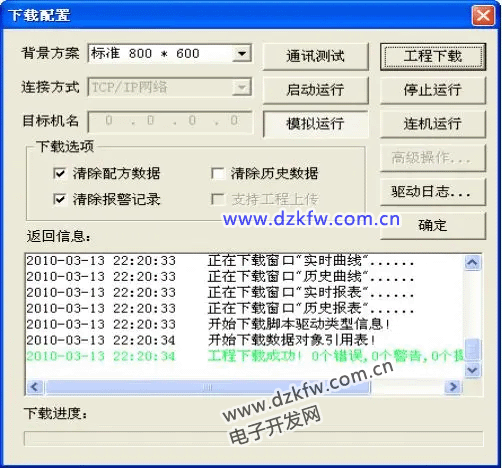 点击下载配置中的“停止运行”按钮,或模拟运行环境窗口中的停止按钮工程停止运行;点击模拟运行环境窗口中的关闭按钮使窗口关闭。下载过程图如图实训7-23所示。