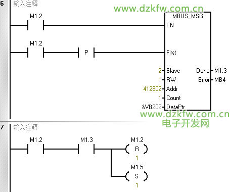 程序段7使用轮询的方式来做,当M1.2接通,完成位M1.3接通复位M1.2并置位下一条MSG指令M1.5。