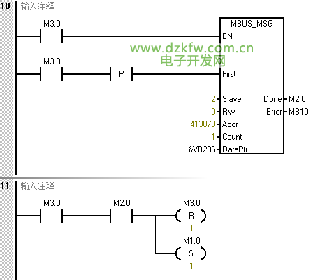 程序段7使用轮询的方式来做,当M3.0接通,完成位M2.0接通复位M3.0并置位下一条MSG指令M1.0。