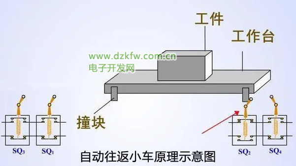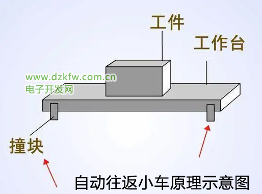 工作台在左右一条线上自动往返运行,底部有撞块,到达左边的限位时自动变为右行,碰到右边的限位自动变为左行,直到我们按下停止按钮工作台才会停下来。