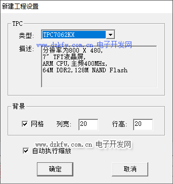 MCGS嵌入版组态软件提供的S7200PPI构件用于MCGS软件通过MPI适配器读写西门子SMART系列PLC设备的各种寄存器。驱动类型为串口子设备,须挂接在“通用串口父设备”才能工作,通信协议为MPI,通信方式为一主一从通令方式。驱动构件为主,PLC设备为从。如图1所示打开昆仑通态最新MCGS编程软件,新建工程,选择相应的触摸屏型号TPC7062KX,并点击确认。