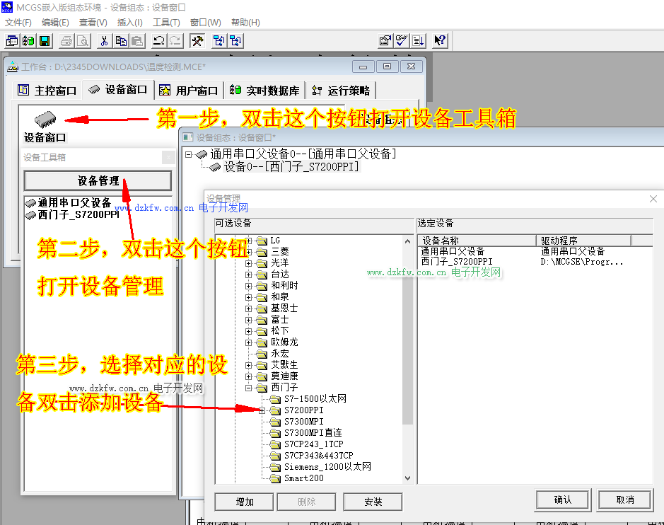 在弹出的对话框内点击设备窗口,如图2所示双击下方设备窗口,进入设备窗口后,窗口内显示空白,此时右击选择设备工具箱,弹出设备工具箱界面,如图3所示,点击设备管理,需选择PLC西门子S7200PPI西门子S7200PPI,点击添加。