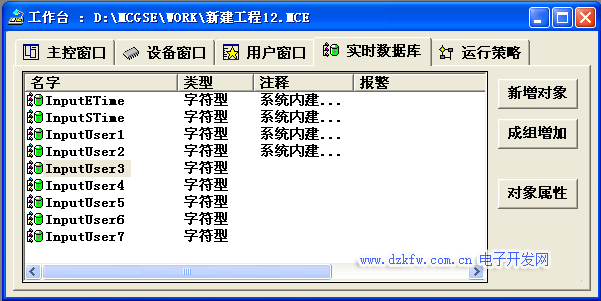 打开工作台的“实时数据库”窗口标签,进入实时数据库窗口页面。如图3-1所示。按“新增对象” 按钮,在窗口的数据变晕列表中增加新的数据变晕。多次按该按钮则增加多个数据变晕,系统默认定义的名称为“InputUser3”、“InputUser3”、“InputUser3”等。