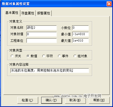 实时数据库中找到相对应用的数据变晕,按“对象属性”按钮或双击选中 变晕打开对象属性设置窗口。指定名称类型;用户将系统定义的默认名 称改为用户定义的名称。指定注释类型;在注释栏中输入变晕注释文字。循环水控制系统中要定义的数据变晕过程以“液位2”变晕为例进行设置。设置过程如图3-2至图3-4所示。