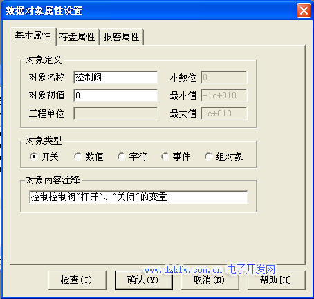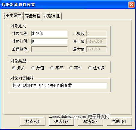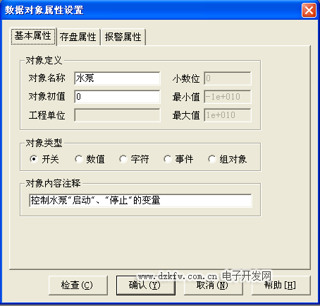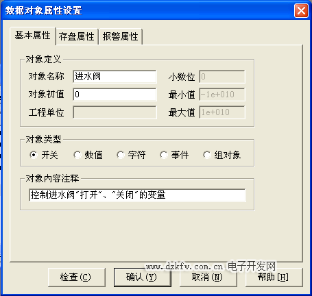 水泵、进水阀、控制阀、出水阀四个开关型数据对象,属性设置只要把数据对象名称改为 水泵、出水阀、进水阀、控制阀;对象类型选中“开关”,其他属性不变,如图3-5至图3-8所示。