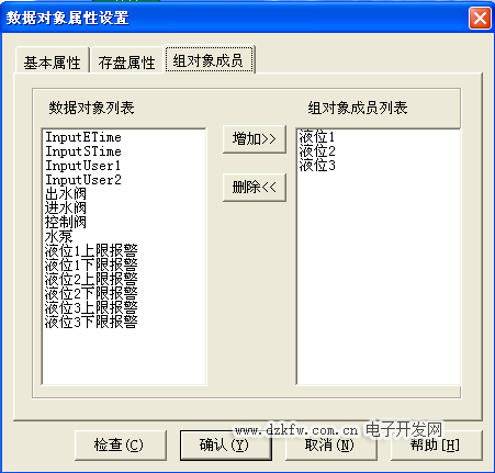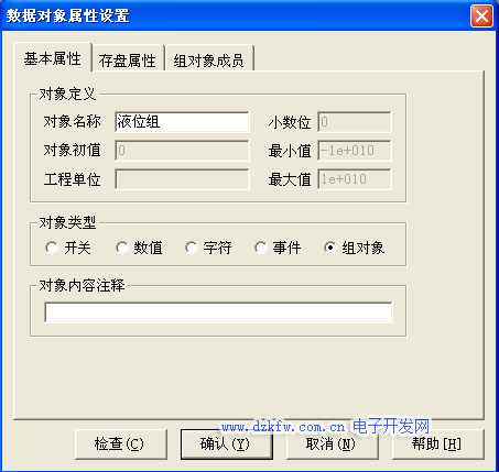 新建一个数据变晕打开基本属性,对象名称为 液位组,对象类型为组对象其他属性设置不变。在组对象型存盘属性中,数据对象值的存盘选中定时存盘,存盘周期设为5秒。在组对象成员中选择“液位1”,“液位2”,液位3”。具体设置如图3-9至图3-11所示。
