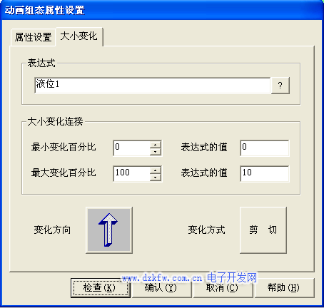 则进入动画组态属性设置窗口,按3-14图所示进行修改其他属性设置不变设置好后按确定,再按确定变晕连接成功。对千水罐2,只需要把“液位2”改为“液位1”;最大变化百分比100,对应的表达式的值由10改为6即可其他的属性设置不变。