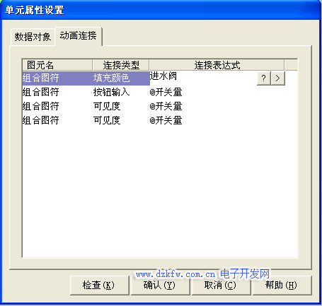 用户窗口中打开循环水控系统制窗口,选中进水阀双击则弹出单元属性设置窗口,如图3-15所示。开单元属性设置窗口中的动画连接选项选择组合图符则会出现,如图3-16所示。单击则进入动画组态属性设置窗口按图3-17所示修改,其他属性设置不变。设置好后按确定按钮完成变晕的连接。水泵、出水阀、控制阀的属性设置与进水阀属性设置相同。