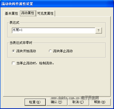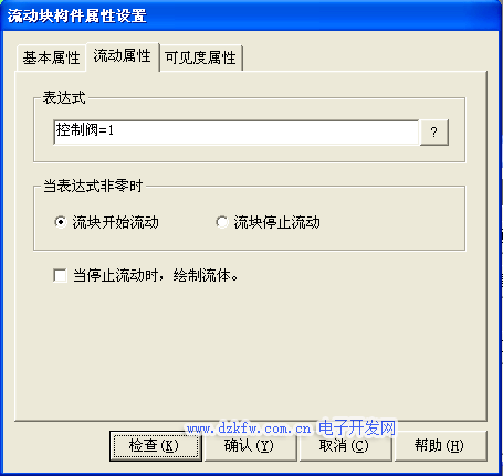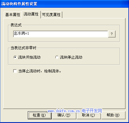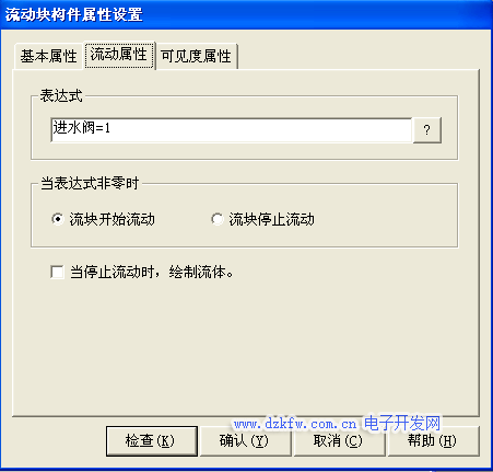 水罐1与进水阀之间的流动块构件属性设置只需要把相应表达式改为 进水阀=1即可其他属性不进行修改,如图3-22所示。进水阀与水池之间的流动块构件属性设置只需要把相应表达式改为 进水阀=1即可其他属性设置不进行修改,按确定完成设置,如图3-22所示。
