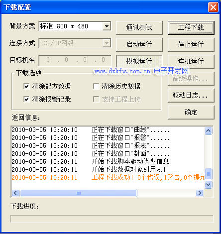 标,进入到下载配置窗口。点击模拟运行在进入工程下载后进入工程下载环节,提示工程下载成功后按启动运行按钮可以进入模拟运行环境。当在反馈信息提示栏中有错误提示时,要修改完所有错误信息后,系统提示工程下载成功才能进入相应的运行环境,如图3-26所示。