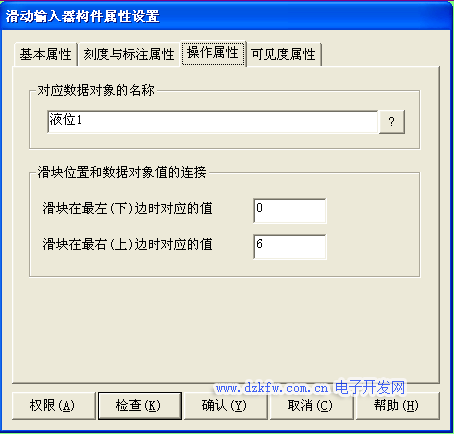 以液位1为例进行讲解 打开滑动输入器构件属性设置的“基本属性”窗口进行输入器构件的外观和滑块指向的设置,在“滑块指向”中选中“无指 向”,其他属性设置不变,如图3-29所示。滑动输入器构件属性设置的“刻度与标注属性”中,把“主划线数目”改为 6,“次划线数目”改为 2,标注间隔该为1其他属性设置不变。如图3-30所示。打开滑动输入器构件 属性设置的“操作属性”窗口,把对应数据对象的名称改为 液位1,可以通过单击图标到元件库中选取滑动输入器;“滑块在最右边时对应的值” 为 6,其他属性设置不变。如图3-31所示。滑动输入器构件属性设置的可见度属性设置如图3-32所示。