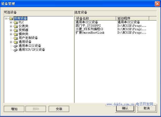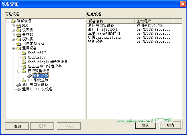 若在“设备工具箱”中没有发现“模拟设备”,请单击“设备工具箱”中的“设备管理”进入可选设备提示框。在“可选设备”中可以看到MCGS嵌入版组态软件所支持的大部分硬件设备。在“通用设备”中打开“模拟数据设备”双击“模拟设备”,按确认后在“设备工具箱”中就会出现“模拟设备”的选项,双击“模拟设备”则会在“设备窗口”中加入“模拟设备”。