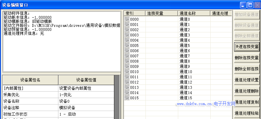 进入设备编辑窗口,设备编辑窗口由三部分组成。第一部分是左上角的驱动信息构件提示框;显示当前的驱动构件的基本信息。第二部分是在驱动信息构件窗口属性下面的设备属性提示框;提示设备 属性信息。设置模拟设备具体操作如下 在“设备属性设置”中,点击“内部属性”会出现