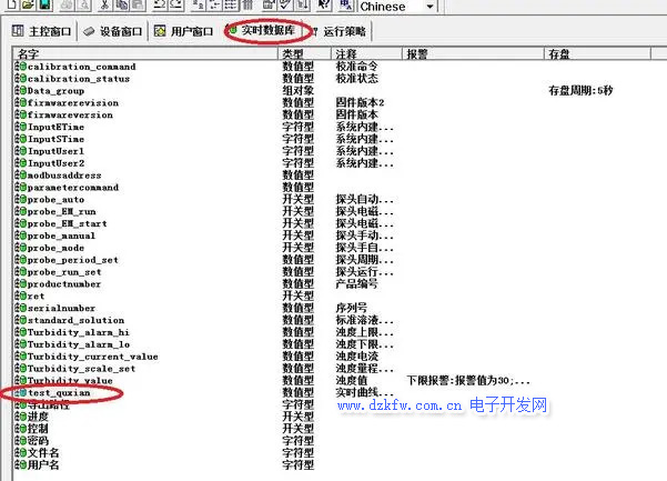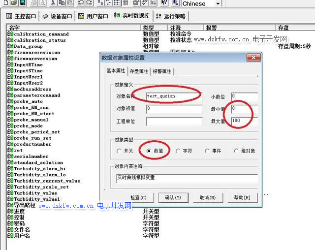 1、在实时数据库中新建一个模拟变量,名称为“test_quxian”,设定该变量的最小值为0,最大值为100。