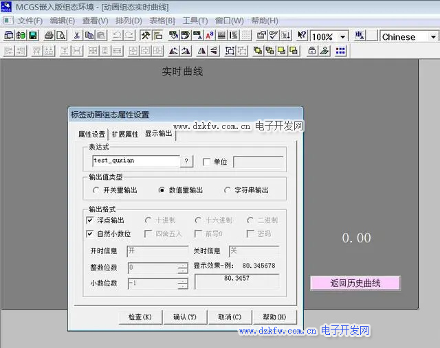 3、新建一个实时曲线画面,在画面上添加“test_quxian”变量的显示,同时做一个按钮,可以返回到历史曲线画面。