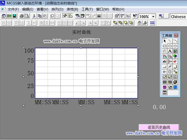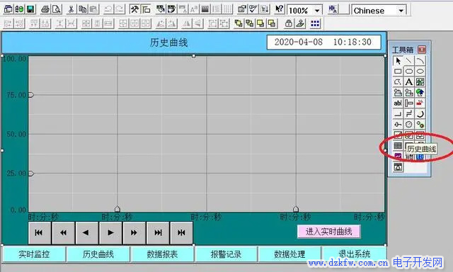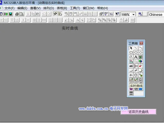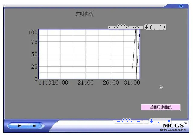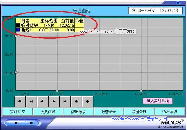实时曲线反映的是现场数据的实时性,以监测该点在现场工况变化的情况下的控制稳定性,因此在实现时需显示曲线的动态变化。通常当前点在曲线的最右端显示,随着时间的推进整个曲线动态地向左移动。历史曲线反映的是过去一段时间内某个或多个监测点的变化趋势,并供工艺人员分析工艺流程的稳定性和故障原因。明白了实时曲线和历史曲线的概念后,我们接下来开始学习MCGS如何做实时曲线和历史曲线。