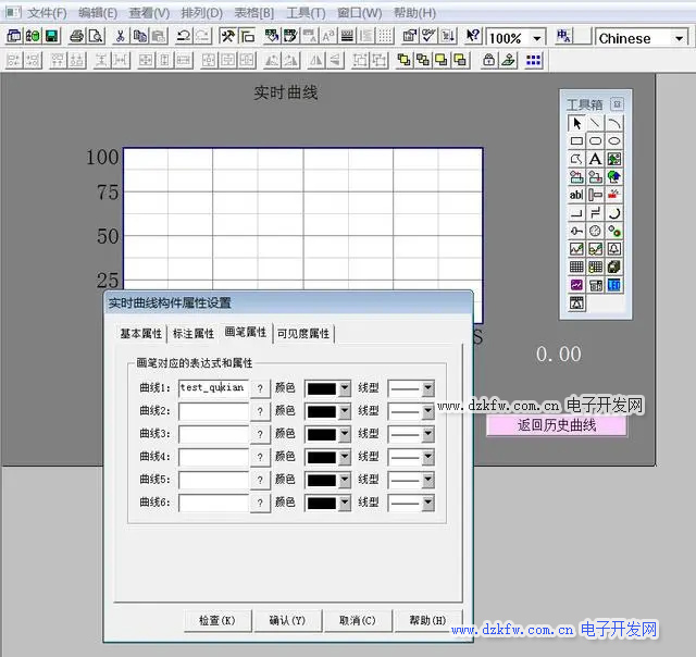 4、在实时曲线画面中添加实时曲线控件,在曲线控件中添加“test_quxian”变量。另外需要配置相应的曲线控件属性,由于比较简单,不再赘述。