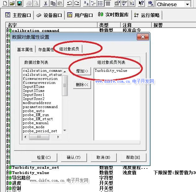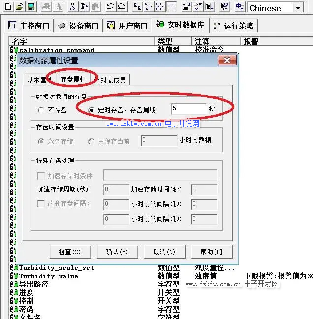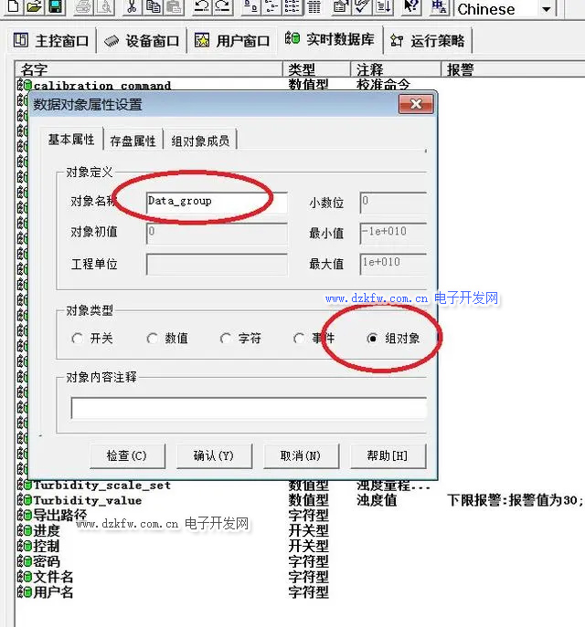 1、在实时数据库中新建一个组对象,在存盘属性中设置存盘周期为5秒,把需要在历史曲线中显示的变量添加到组对象成员列表中。
