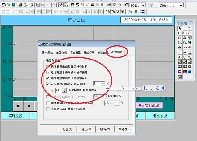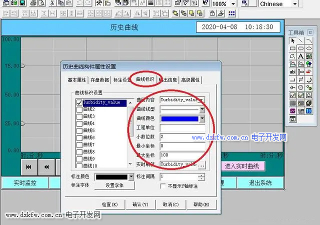 2、在历史曲线画面中添加历史曲线控件,设置历史控件属性。