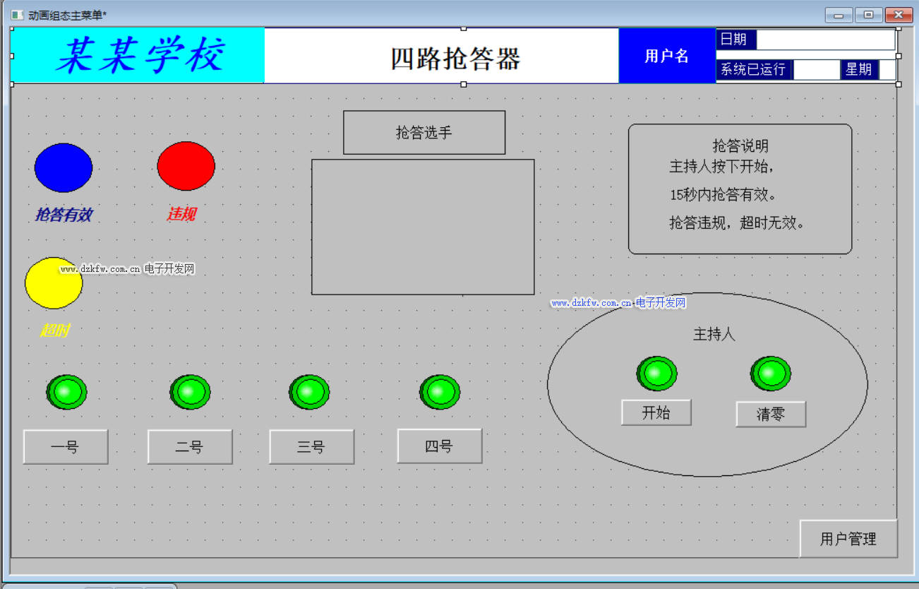 - 主持人按下抢答按钮后,15秒内有人抢答成功,则其他的选手抢答按钮就会无效。同理,在主持人未按下开始按钮时,选手违规抢答也会进行互锁。