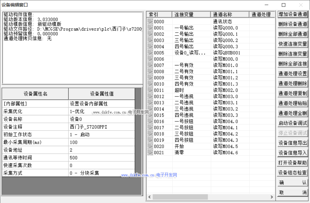 设备的编辑窗口需要创建与PLC程序对应的通道,然后对变量进行一一的连接。