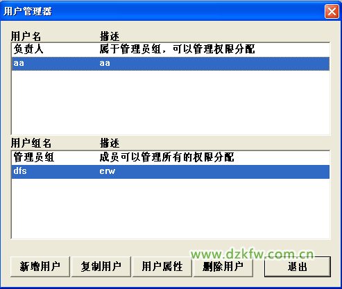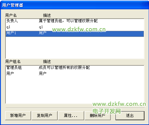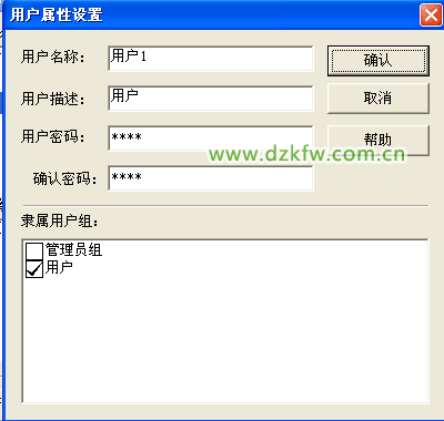 在用户管理器窗口上半部分为已建用户的用户名列表,下半部分为已建用户组的列表。当用鼠标激活用户名列表时,窗口底部显示的按钮是“新增用户”、“复制用户”、“删除用户”等对用户操作的按钮;当用鼠标激活 用户组名列表,在窗口底部显示按钮是“新增用户组”、“删除用户组”等对用户组操作的按钮。按新增用户按钮弹出如下用户属性设置窗口,在该窗口中用户对应的密码要输入两遍用户所隶属的用户组在下面的列表框中选择。当在用户管理器窗口中按“属性”按钮时弹出同样的窗口,可以修改用户密码和所属的用户组但不能够修改用户名。