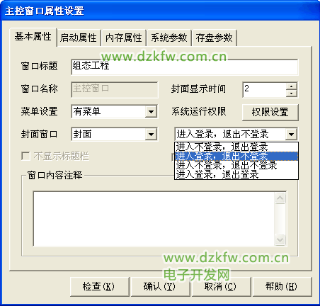 点击“权限设置”,设置工程系统的运行权限,同时设置系统进入和退出时是否需要用户登录,共四种组合 “进入不 登录,退出登录”、“进入登录,退出不登录”、“进入不 登录, 退出不 登录”、“进入登录,退出登录”。通常情况下,退出MCGS嵌入版组态软件系统时,系统会弹出确认对话框。